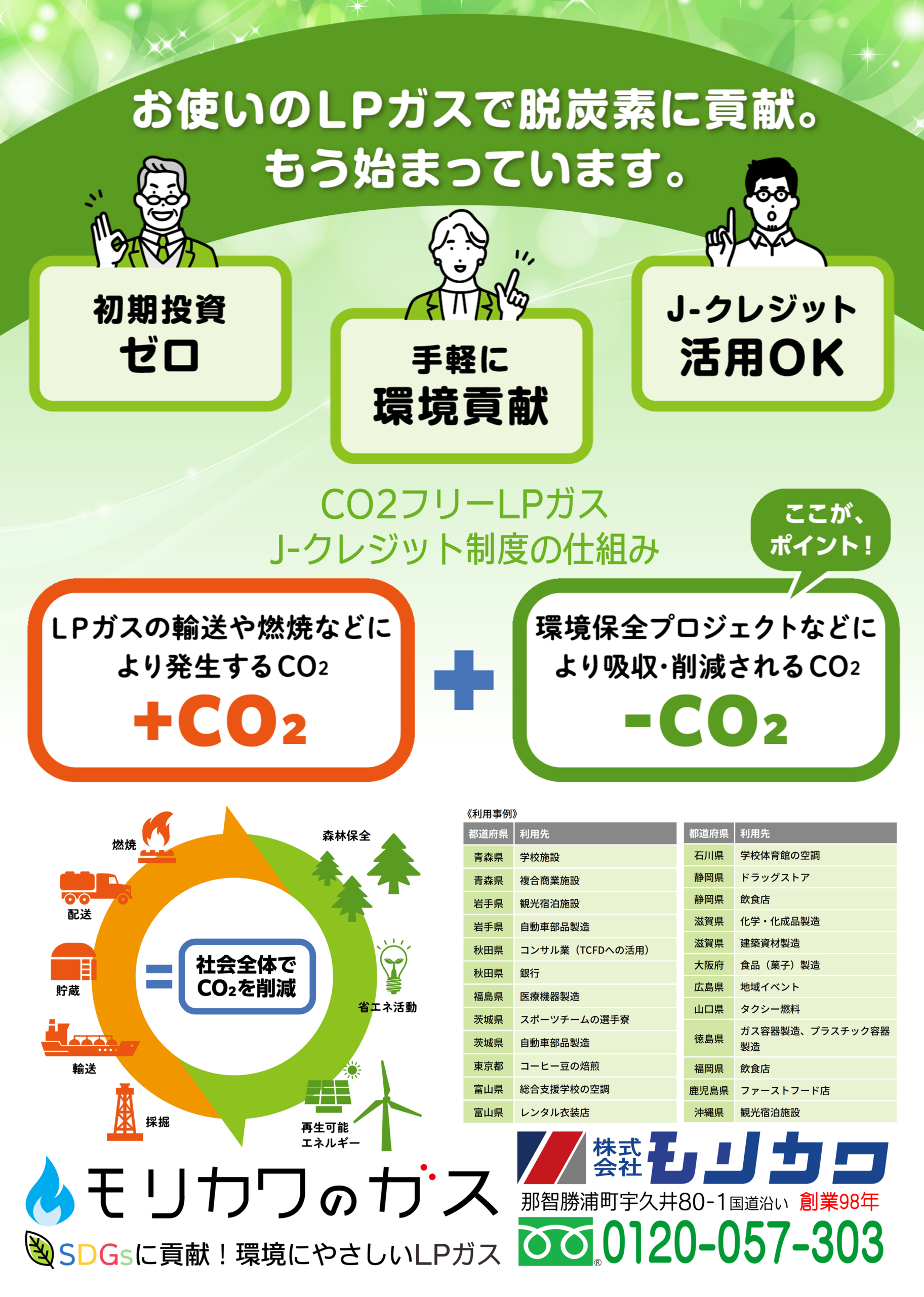 CO2フリーLPガス モリカワのガス CO2フリーLPガス CO2フリーLPガスJ-クレジット制度の仕組み LPガスの輸送や燃焼などにより発生するプラスCO2 環境保全プロジェクトなどにより吸収・削減されるマイナスCO2 関連記事 地震津波対策のLPガスプラン岩谷産業株式会社 カーボンオフセットLPG供給契約証明書 Jークレジット社是・経営理念灯油巡回販売割引券地震のとき会社概要 投稿ナビゲーション LPガスで脱炭素
